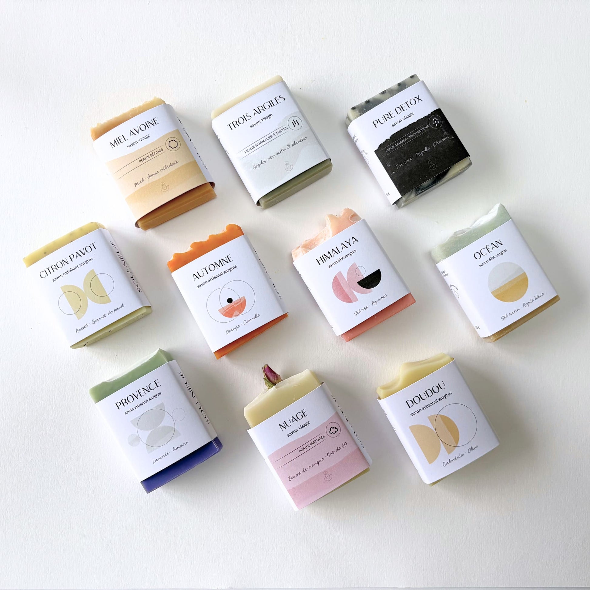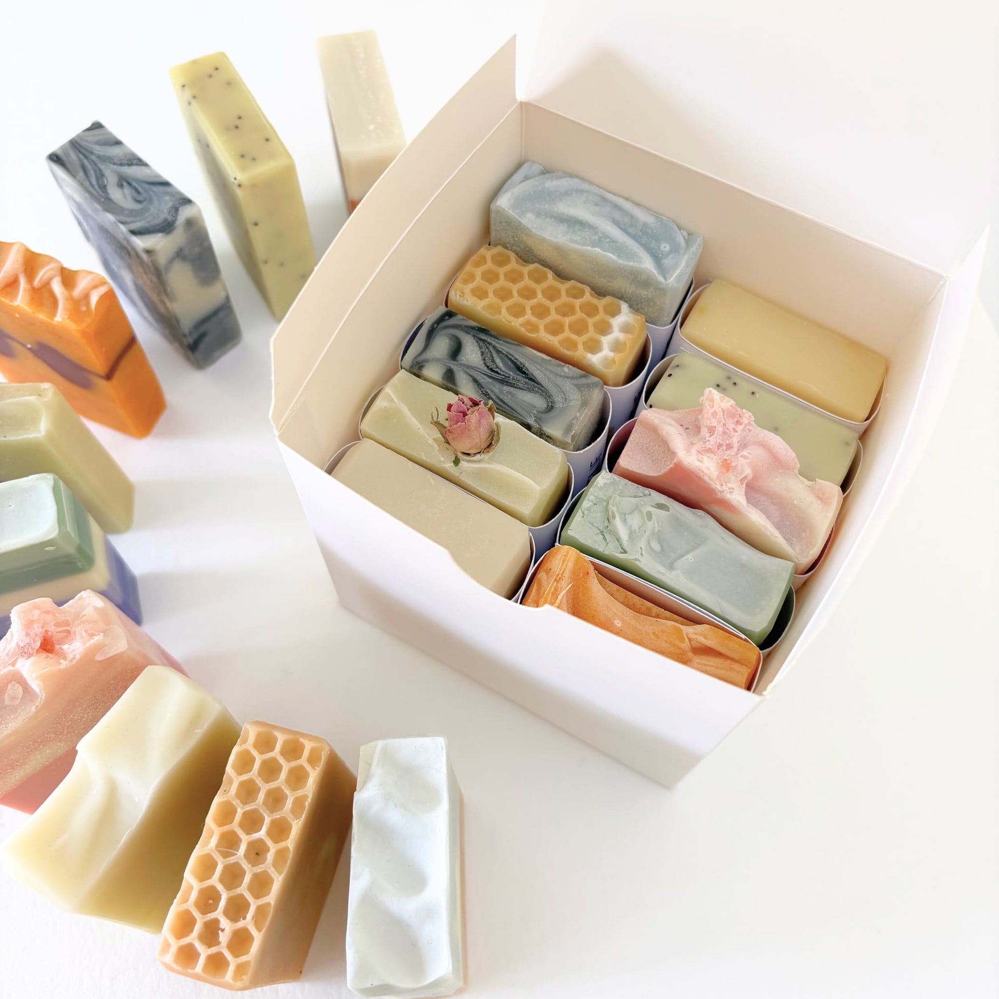 Les 10 savons sont rassemblés dans une jolie boite blanche en carton, prête à offrir.