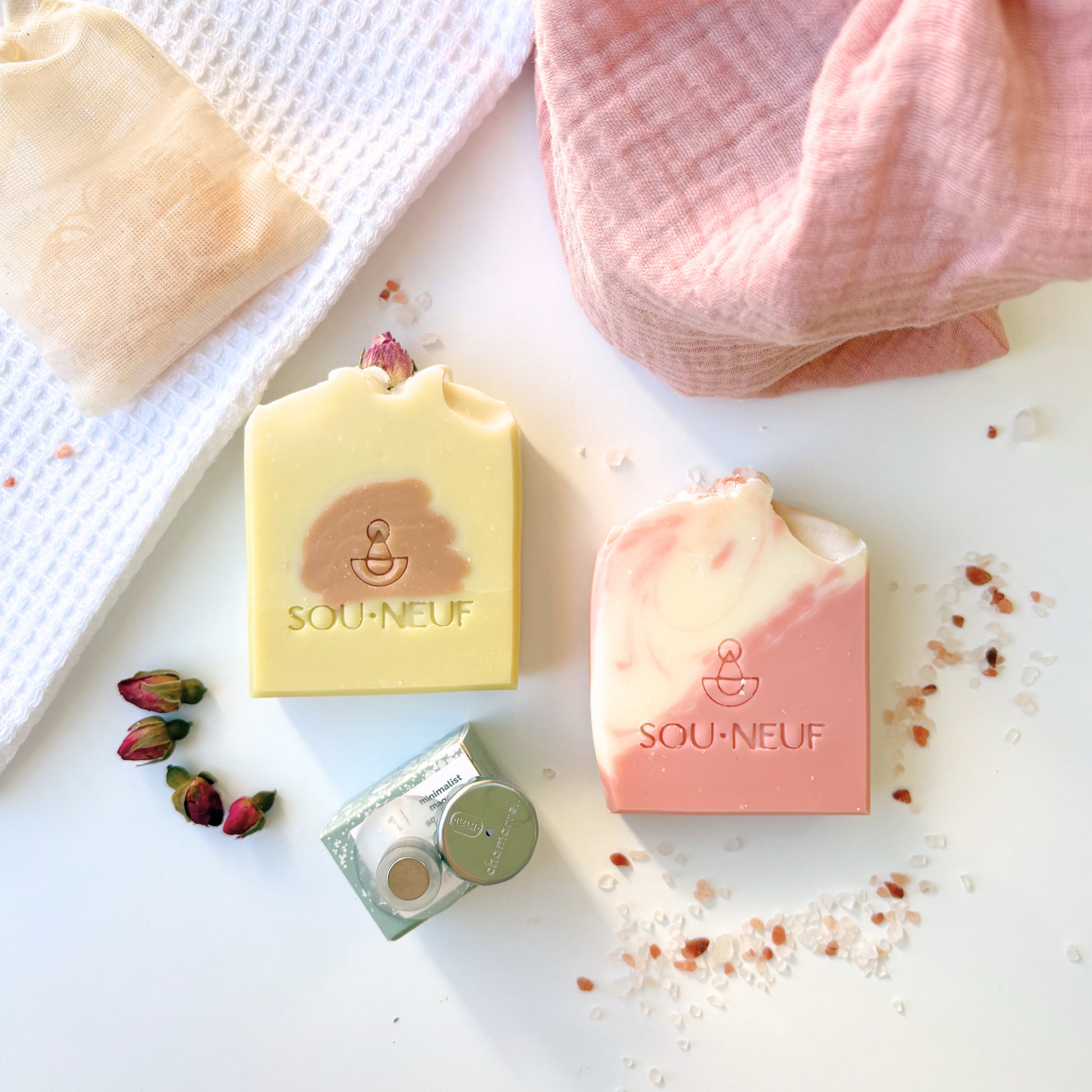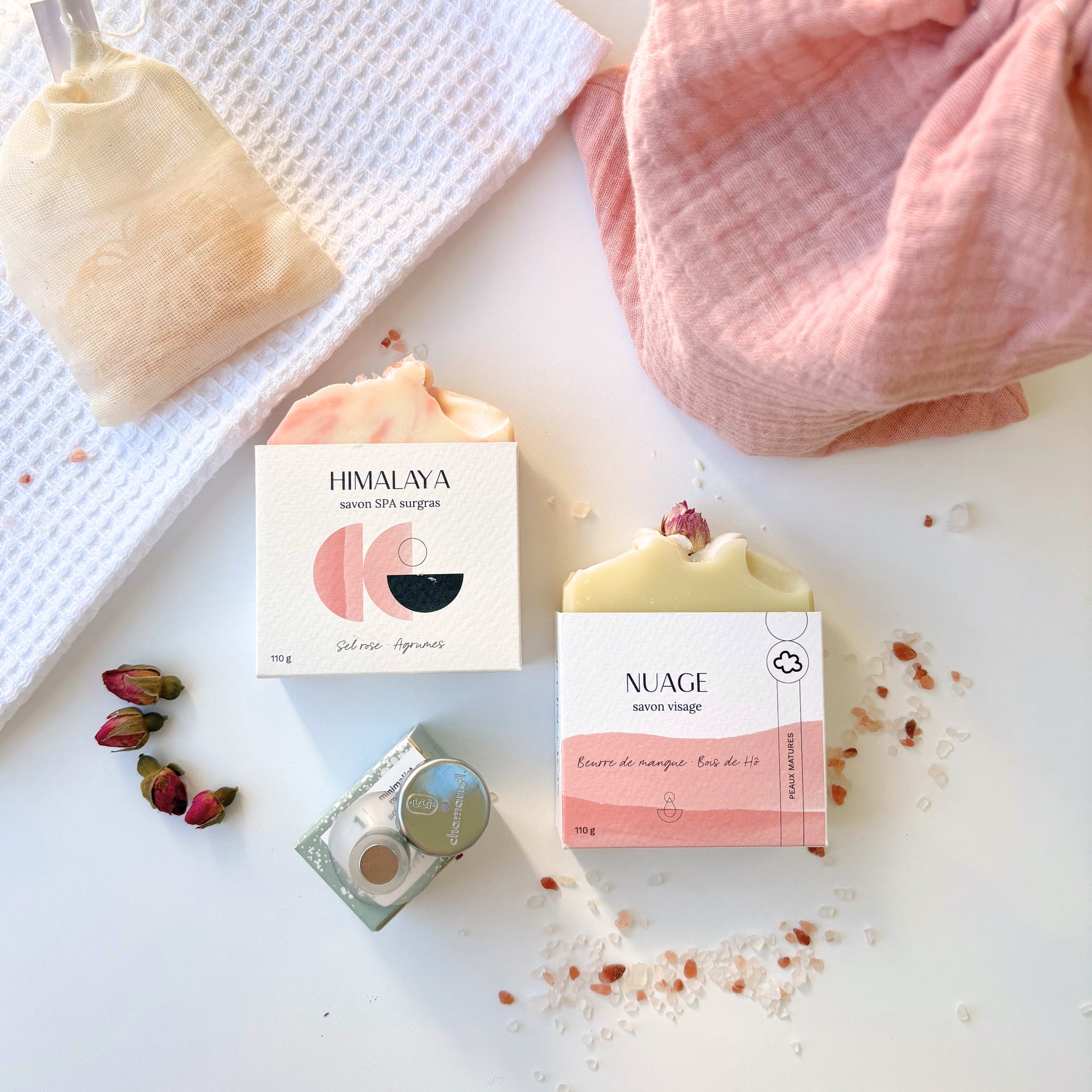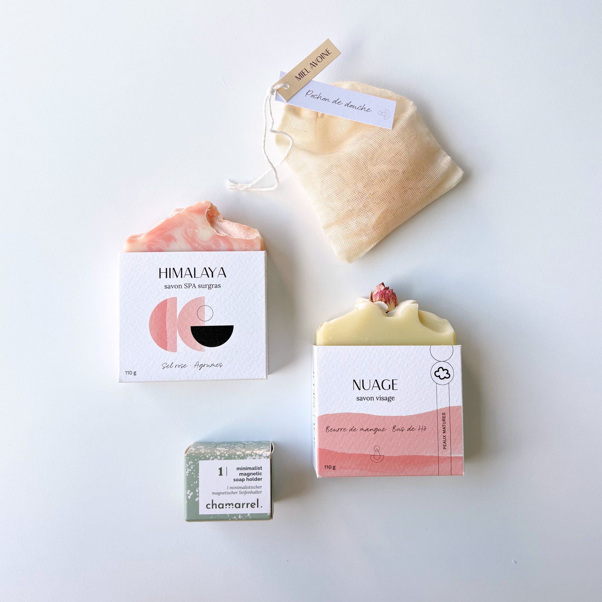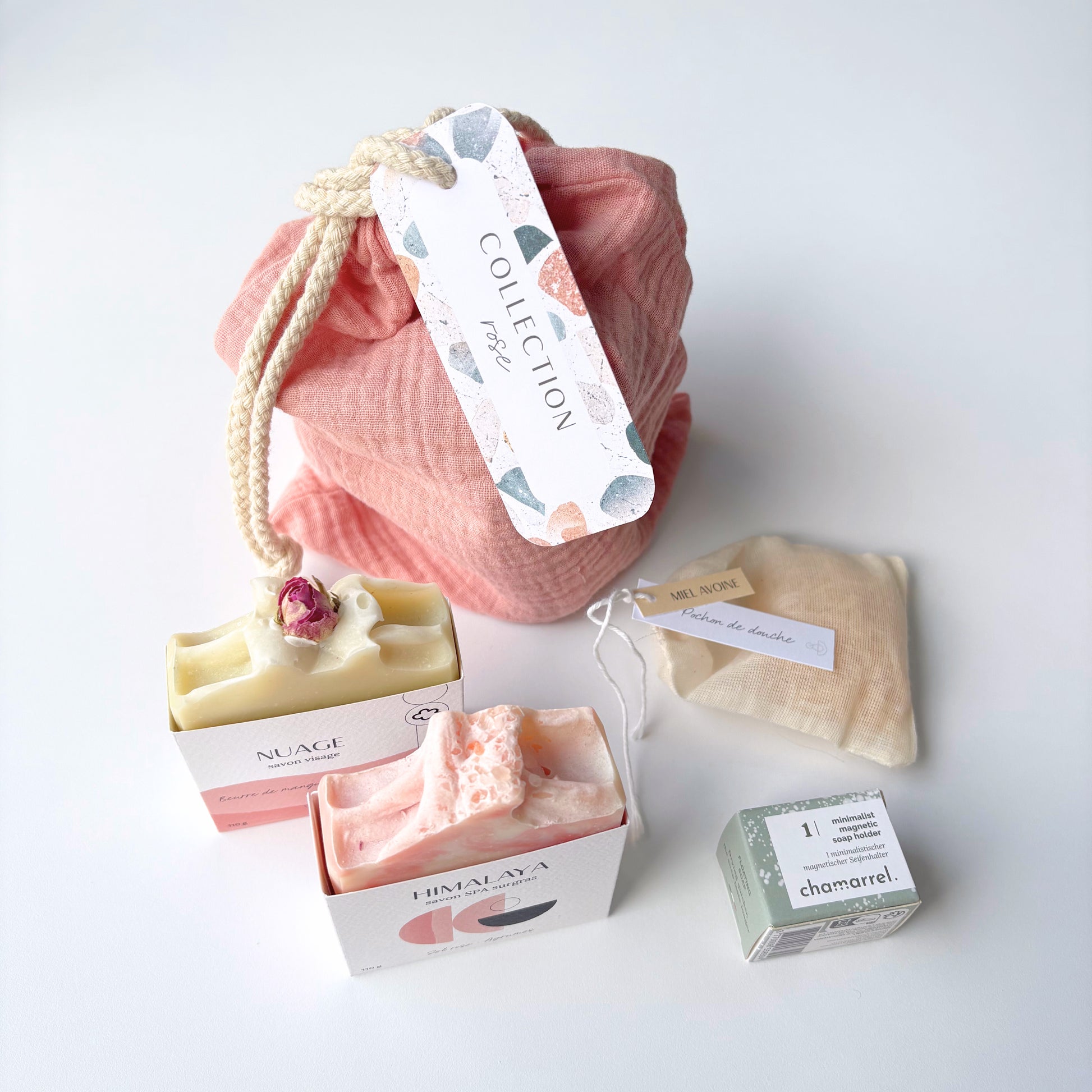 Ce joli coffret réunit deux savons iconiques de la gamme et des accessoires zéro déchet, dans un grand pochon en gaze de coton rose réutilisable.