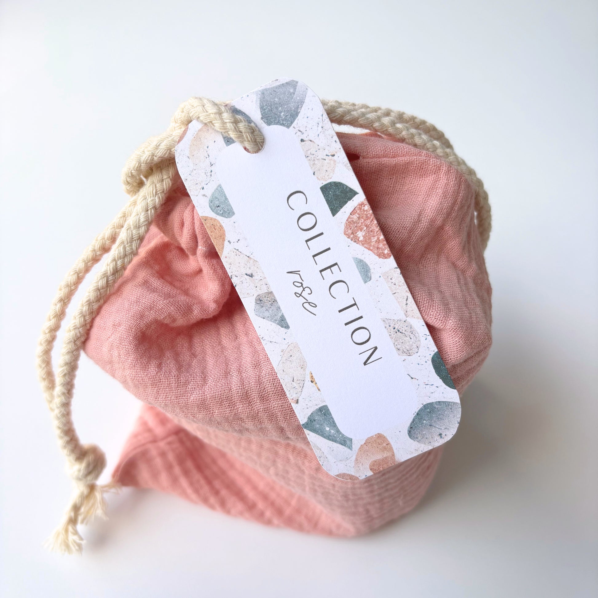 Grand pochon en gaze de coton rose : élégant et réutilisable, parfait pour offrir ou ranger vos essentiels.