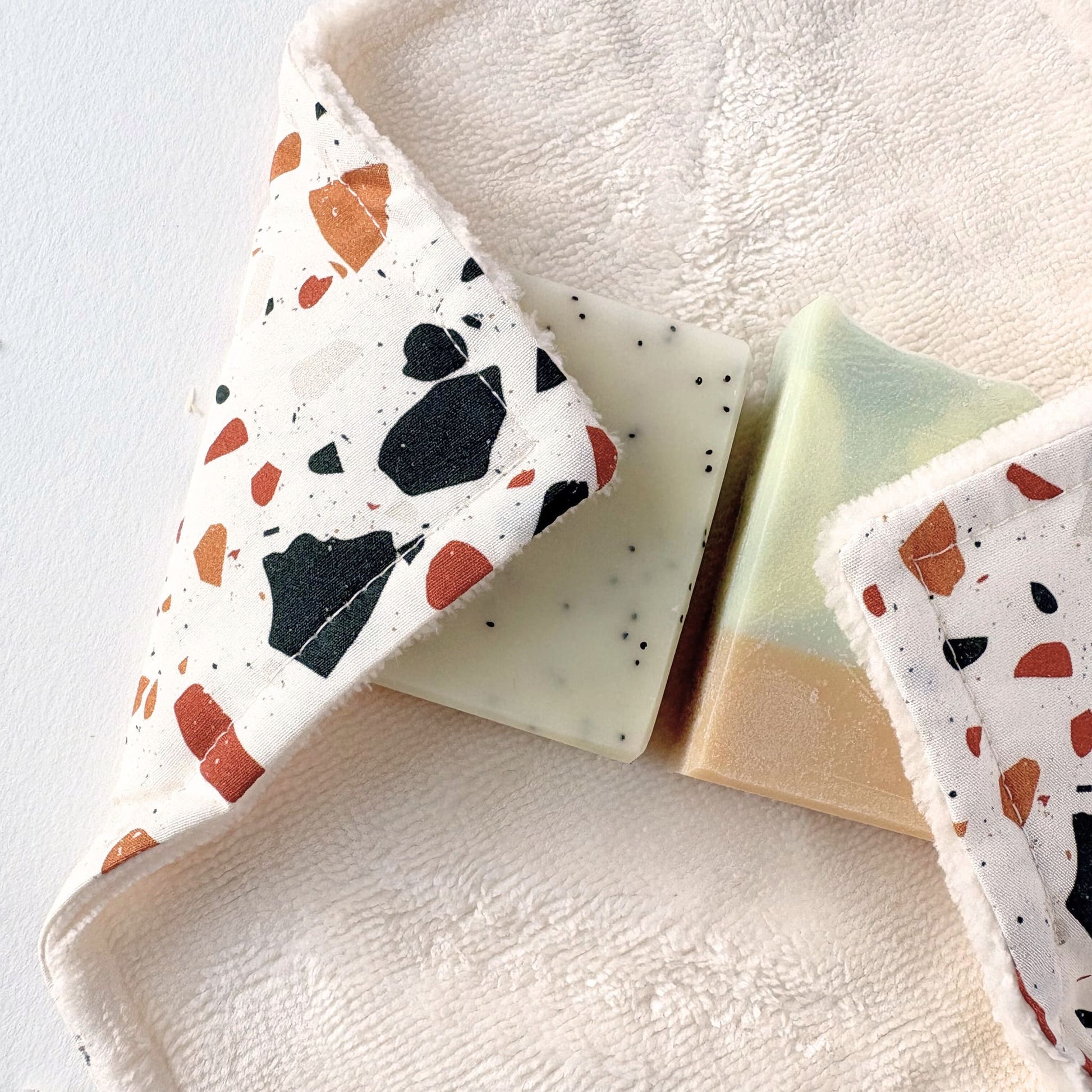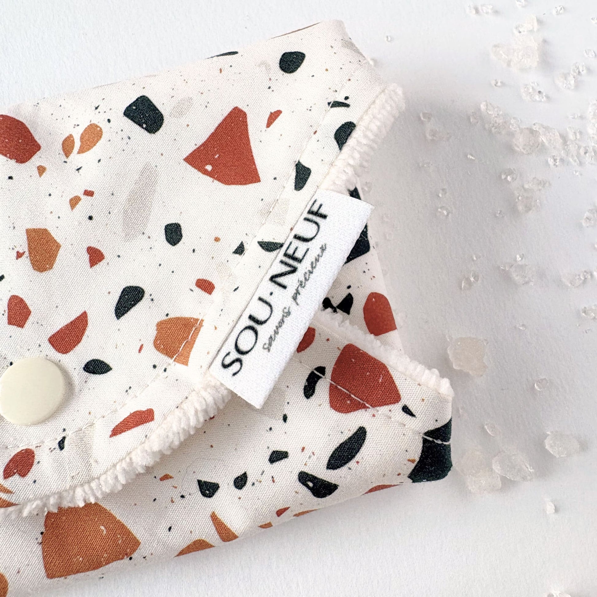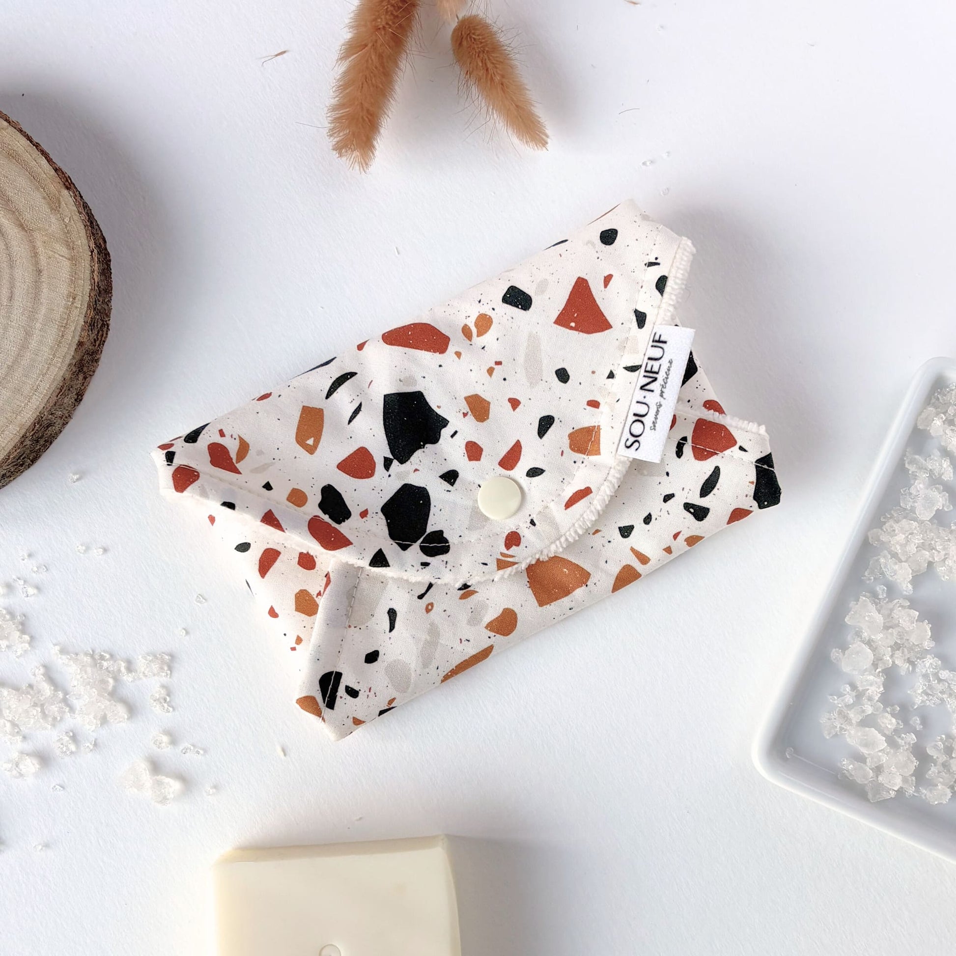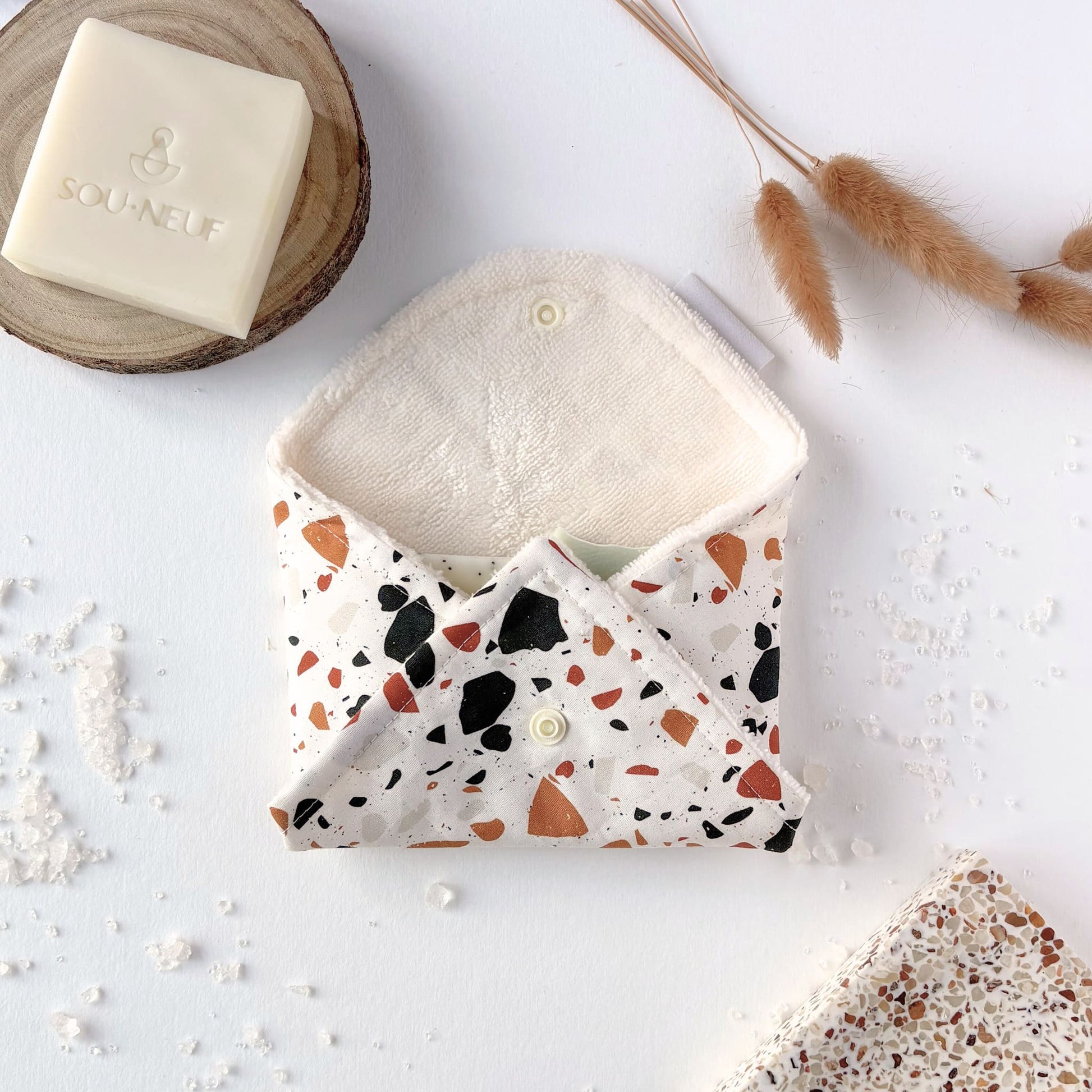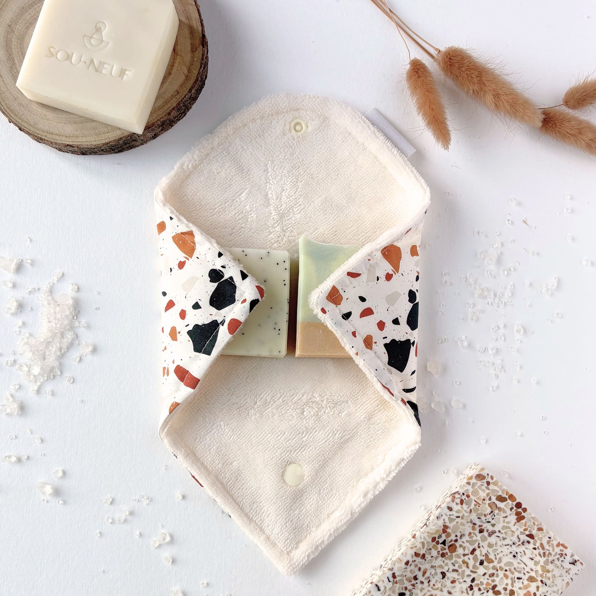 Cousue à la main en exclusivité pour Sou Neuf, cette pochette signature est l’alliée idéale de vos savons, pour les emporter partout avec vous. Son imprimé Terrazzo est inspiré du sol de mon atelier, comme un clin d’œil à l’univers artisanal où naissent tous les savons.